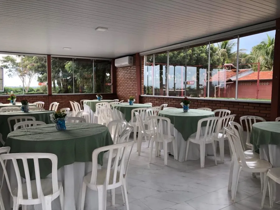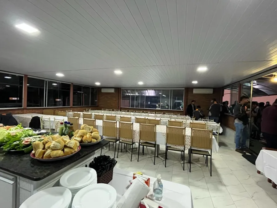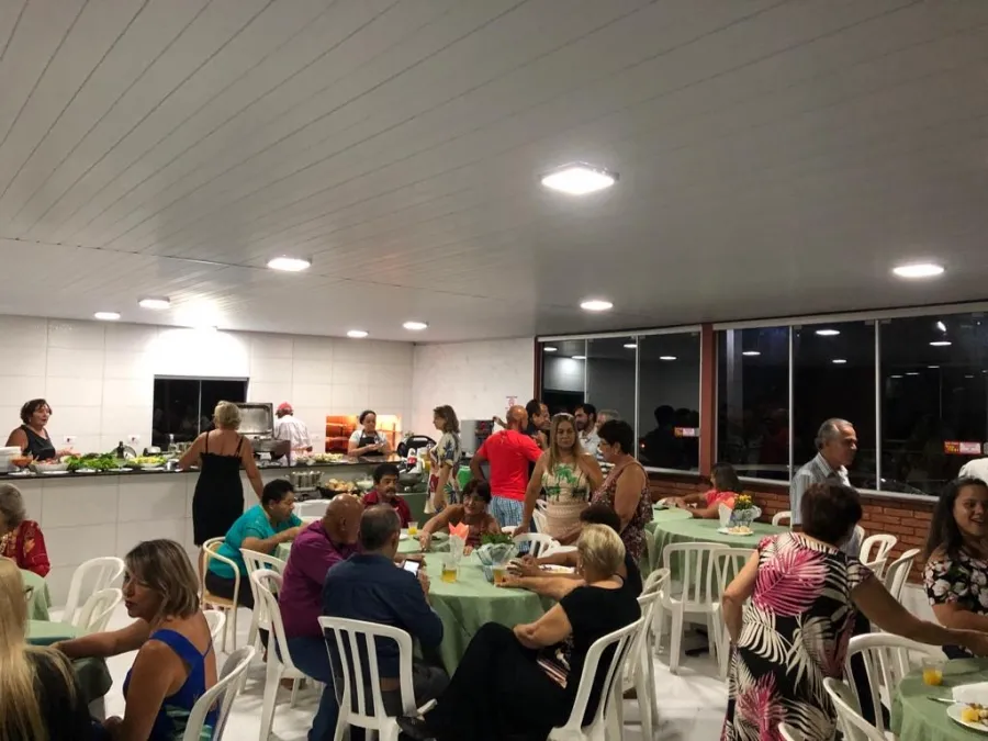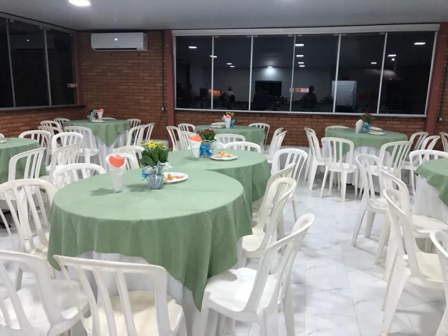 Nosso Salão de festas foi recém reformado. Está totalmente remodelado e conta com janelas de blindex, banheiros internos, ar condiconado, freezer, geladeira, fogão, Tv, 2 churrasqueiras, utensílios como pratos, talheres, copos, etc. Acomoda até 70 pessoas.